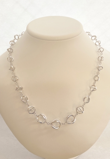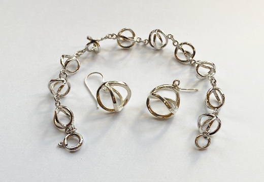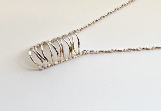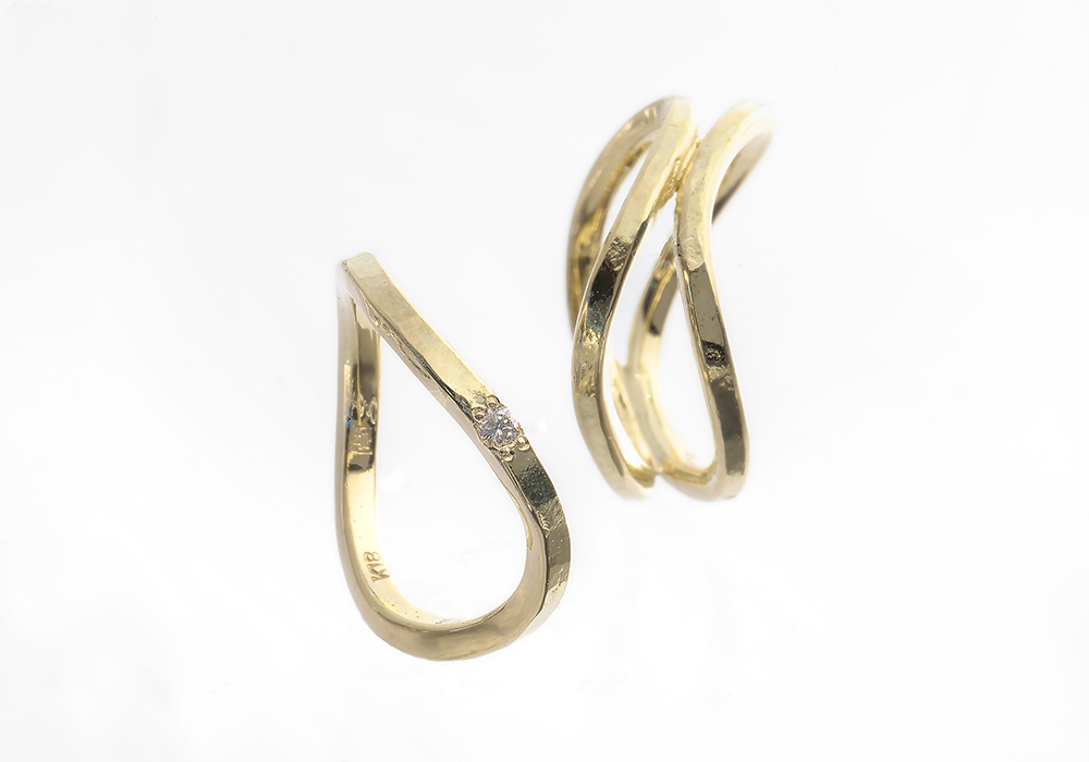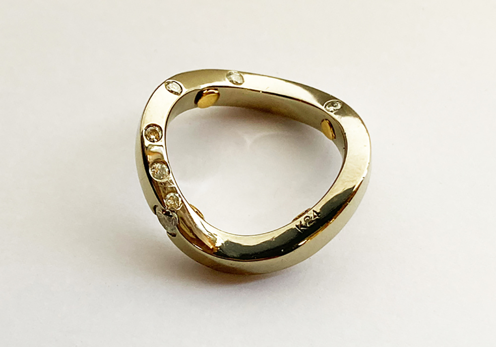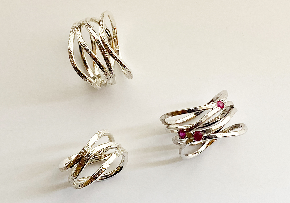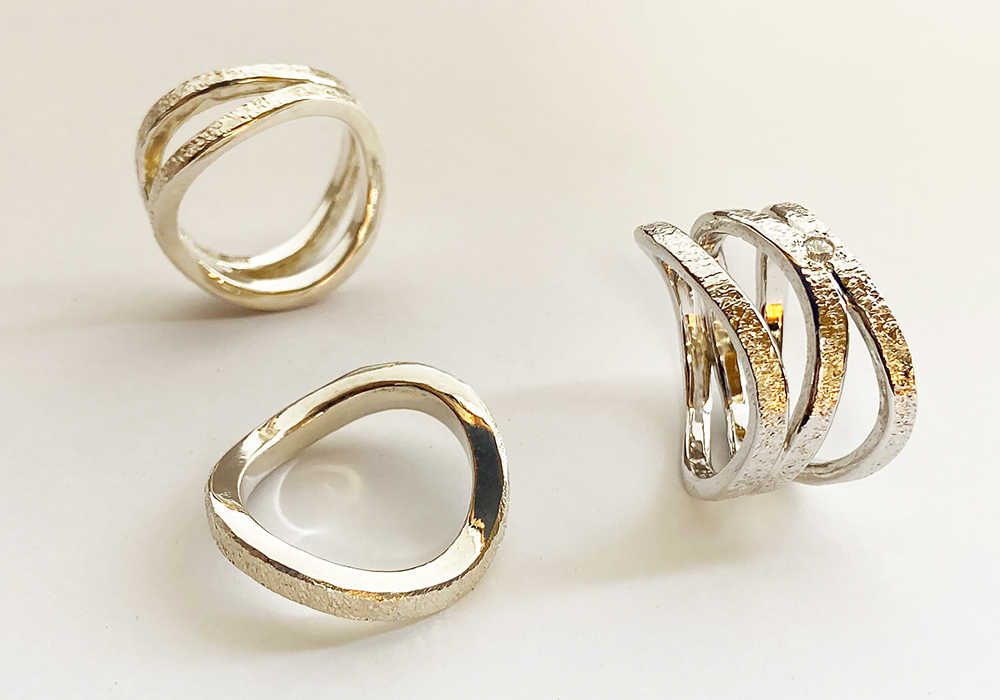 「ゆらぎ」を発想の原点にし、重ねていくことで柔らかい空間のあるリングを表現しています。また、ゆらぎの形を垂直に合わせることで球形を作りネックレス等にしています。それらすべてを「宙(そら)」のシリーズと名づけました。