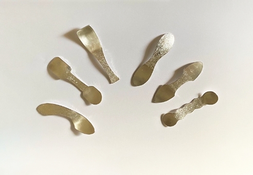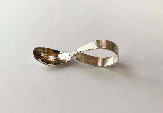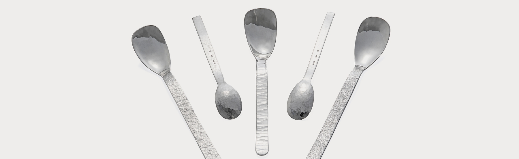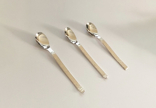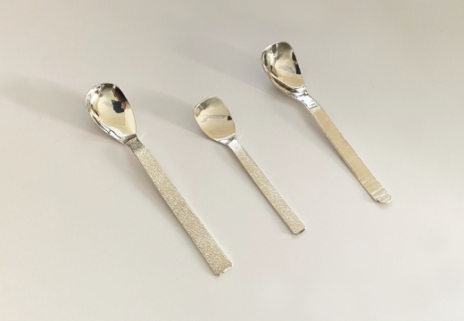 コロナ禍で家時間が増えた時に家で使うものを作りたいとスプーンの制作を始めました。金属をハンマーで叩くという鍛造の基本にかえって1本の棒材を叩いて作っています。銀の棒材を火で熱して叩いて延ばし、硬くなればまた熱する。これを繰り返すと金属内部の空隙をつぶし、結晶を微細化し結晶の方向を整えることで金属の強度が高まります。銀ならではの口当たりのよさを生かしてヨーグルトやアイスクリームなどのスイーツのスプーンにおすすめです。